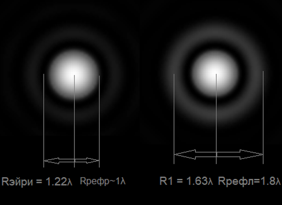 Итого имеем, что по разрешению Рефрактор превосходит Рефлектор на 1.8/1 = 80%.Проще говоря, в разрешении рефрактор 150мм эквивалентен 270мм рефлектору.