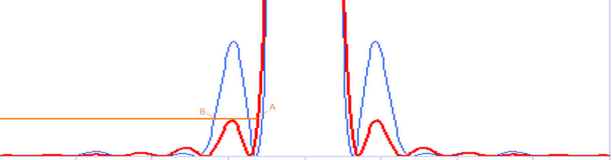 Зачем брать так далеко-то? Аж второго максимума. В первом случае измеряли до первого минимума и даже меньше, а во втором до второго максимума. Как раз наоборот, у экранированных систем сам диск Эри даже меньше, чем у неэкранированных! И разрешение при определенных условиях даже выше. Так что никакого заметного отрыва не будет. Не всё так просто.
