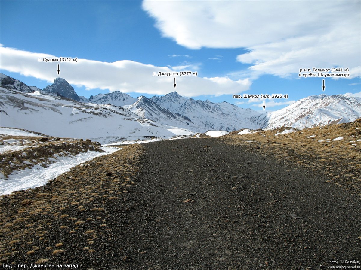 Но если уж сильно захочется совершенно открытого горизонта, то с перевала можно подняться пешком на соседнюю вершину Талычат 3441м