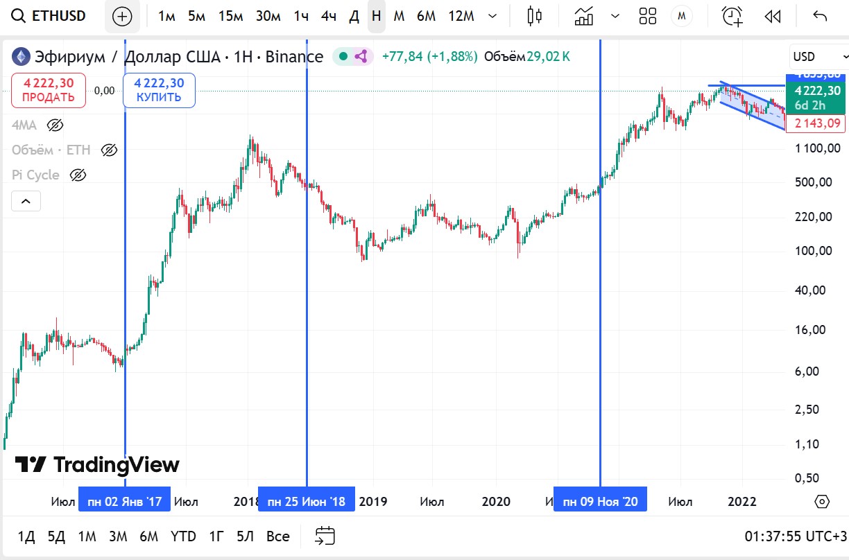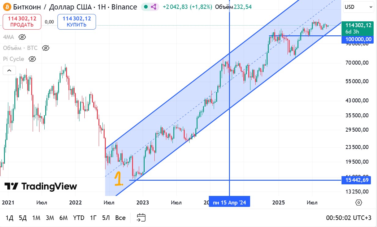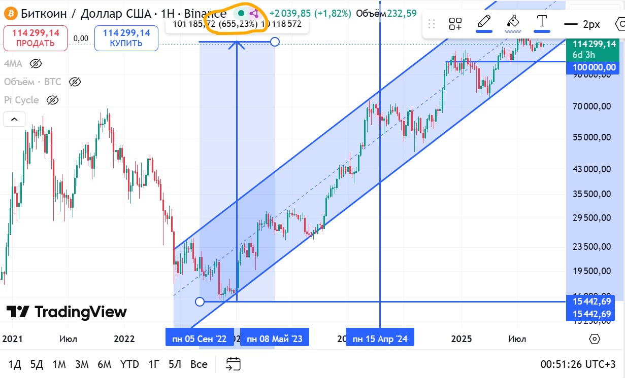 Но вы смотрите узко, как и положено дилетанту. Давайте я вам ширше покажу. Мы словами не работаем как вы. Нам нужны цифры и чарты. Давайте я отодвину график и покажу вам коридор и как он идет по каналу за 2 года? Чарт не просто в порядке, он в восходящем тренде. Что радует всех, кроме дураков... в начале 2023 года - эта позиция называется локальное дно. Естественно вам это не нравится. А всем профи - это очень нравится. Профи покупают там по цене 15442, видите?