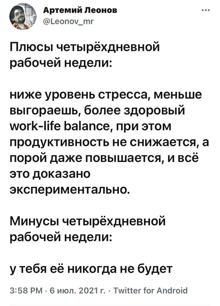 В Исландии почти всей стране разрешили работать меньше после эксперимента с сокращённой рабочей неделей https://pikabu.ru/story/v_islandii_pochti_vsey_strane_razreshili_rabotat_mensheposle_yeksperimenta_s_sokrashchyonnoy_rabochey_nedeley_8327102Эксперимент провели по инициативе городского совета Рейкьявика и правительства Исландии в ответ на предложения профсоюзов и некоммерческих организаций. В рамках эксперимента в разных организациях продолжительность рабочей недели сократили с 40 часов до 35-36 часов без снижения зарплаты.Масштабы испытаний и разнообразие рабочих мест позволили доказать эффективность сокращенной рабочей недели как для работников, так и для организаций. Производительность труда сотрудников осталась на прежнем уровне или выросла. При этом благополучие людей улучшилось по нескольким показателям: от уровня стресса и выгорания до здоровья и баланса между работой и жизнью.