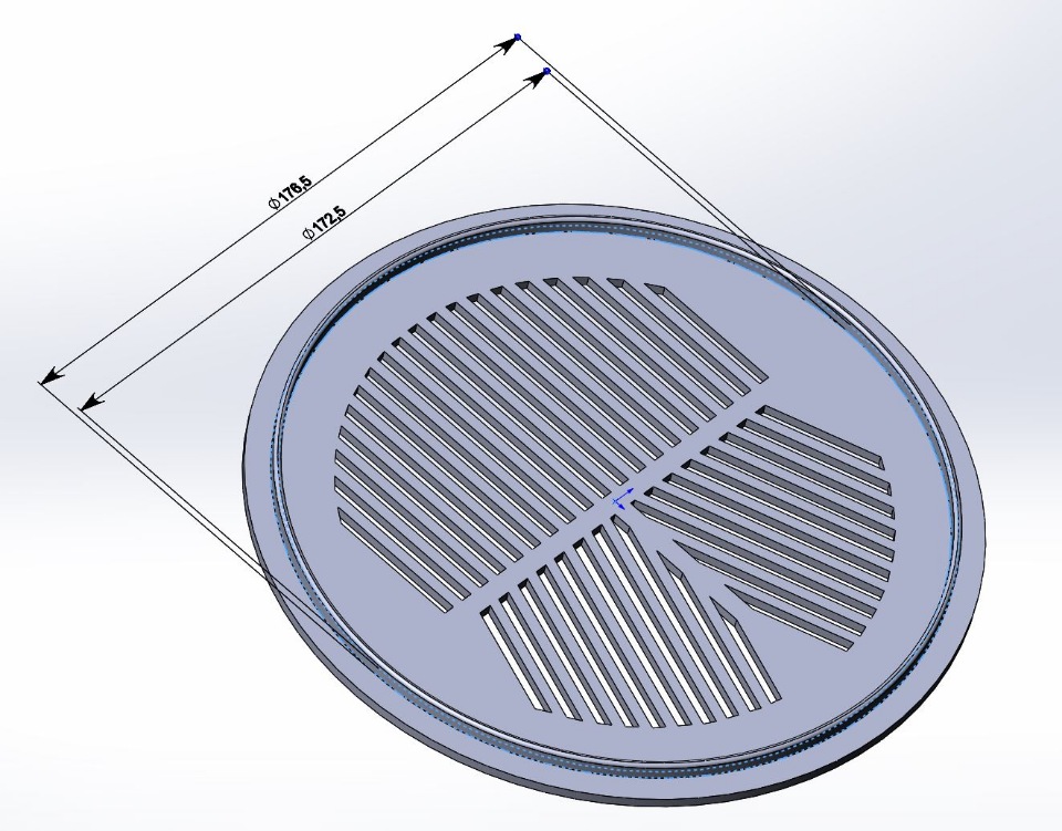 имеем сочную такую рамку на внешней части, со стороны торца. Исходить будем из 178мм - ~1,5 мм. Запас нужен для того, что бы не с хрутом входило, а просто ложилось, подниму бортики и люфта почти не будет. А так как труба в 99% торцом вверх, то и не долна будет выпадывать. Итого получаем для фиксации внутренний диаметр ~176,5
