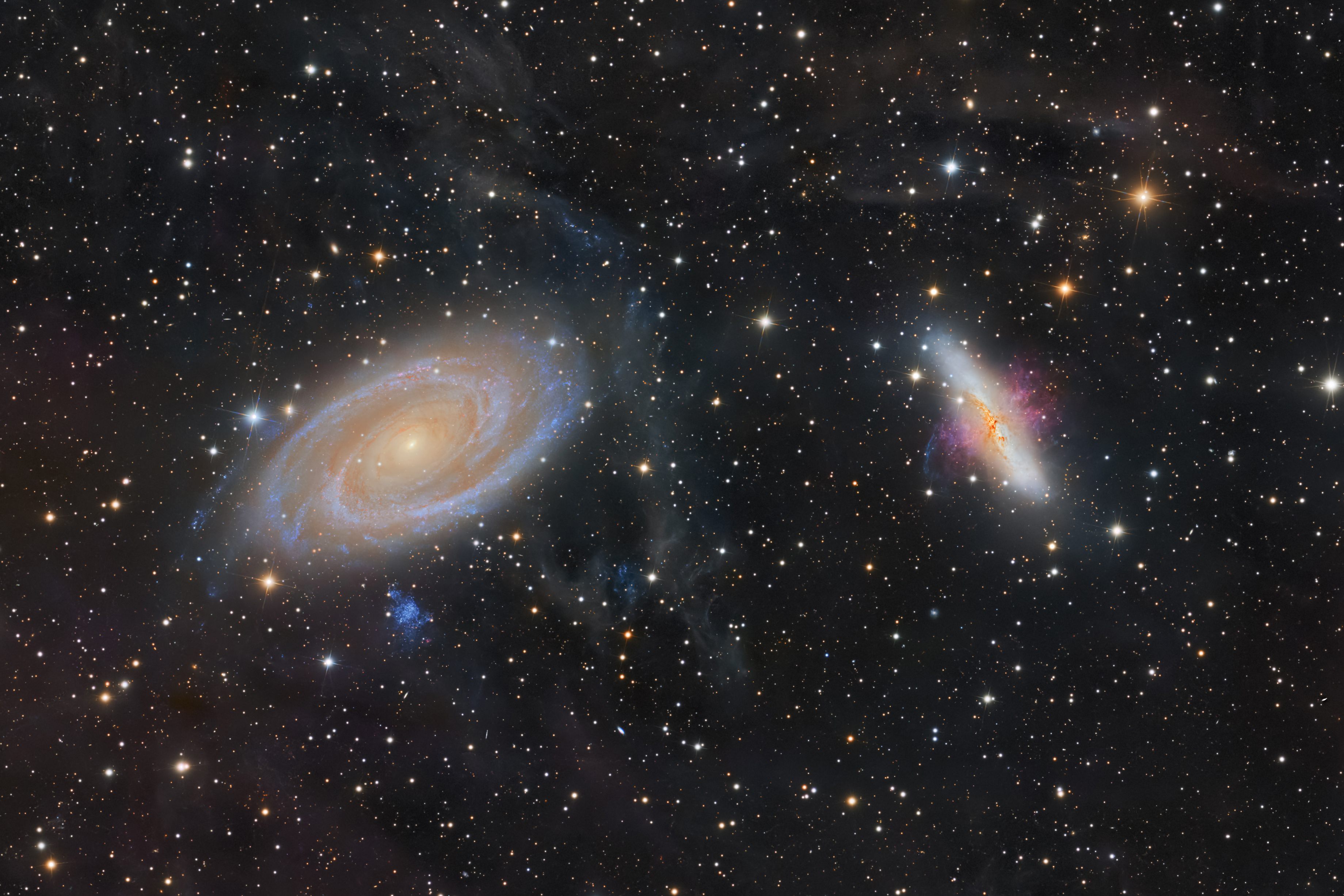 Кто если не мы ? ⎯ команда Pixinsight на русскомЭто наш второй релиз данных по галактикам M81 и M82 (Боде и Сигара). В этом релизе участвуют данные исключительно наших коллег из РФ! Путем объединения множества данных при помощи компьютера, который предоставил нам Сергей Назаров, мы получили глубокое изображение с общей выдержкой порядка 80 ч!Всё это стало реальным благодаря усилиям следующих участников:Дмитрий Крылов — телескоп C11 и камера ZWO ASI2600MC Pro;Сергей Назаров — телескоп C11 HyperStar и камера Player One Zeus (imx455);Василий Чуфарин — телескоп 130PDS и камера ZWO ASI1600MM;Евгений Гений — телескоп 200PDS и камера ZWO ASI294MC Pro;Андрей Иночкин — телескоп C8 и камера ZWO ASI294MC Pro;Тимур Фахрисламов — телескоп 150P Quattro и камера Canon 60Da;Антон Кононенко — телескоп 150PDS и камера Canon 550Da;Артём Максимкин — телескоп 150PDS и камера Canon 550Da;Напомню, что это промежуточный результат нашей команды, мы продолжим собирать данные по этой области неба. Если хотите присоединиться к проекту и дополнить его своими данными, то пишите Тимур Фахрисламову или Максиму Захарову. До новых встреч на просторах космоса!Обработка данных: Тимур ФахрисламовУкладка: Тимур Фахрисламов