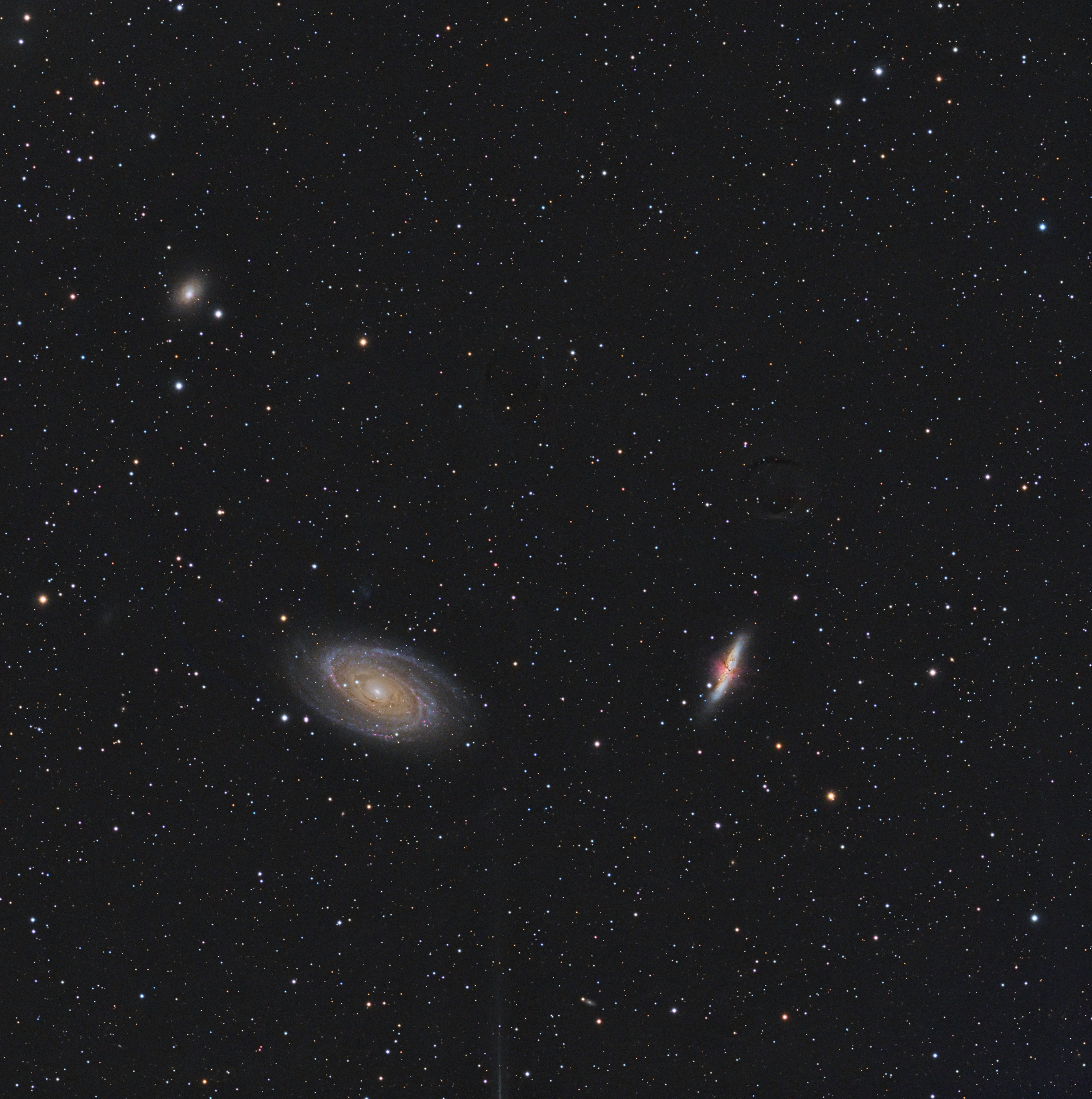 Вторая часть первой сессии c FLI16803. Энтузиазма честно говоря не было обрабатывать, качество исходниковниже среднего, fwhm 5-5,5", флеты косячные вышли (через день на флетбоксеснимал), полнолуние (луна 0,93)... В общем разве что полем камеры повосхищаться (почти 2 на 2 градуса)M81-82 и NGC30778 декабря 2011 г, 40 км южнее ОмскаТелескоп TEC 140, флаттенер TECмонтировка EQ-6 Pro камера FLI Proline 16803, колесо фильтров CWF4-5, фильтры Astodon LRGB внешний гид 80\480, QHY6L - 12 кадров по 5 мин, 7 по 10 мин (всего 130 мин)RGB - 9 кадров по 5 мин (45 мин) в каждом канале, биннинг 2х2Калибровка, дебайеризация - Maxim DL, выравнивание Pixisight, сложение FITStackerV9обработка Pixinsight 1.7