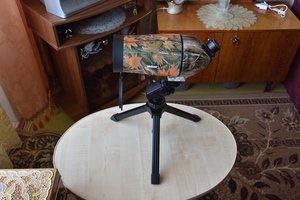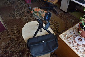 Без комплектного окуляра! Новая труба, ей дней 10 всего. Внутри неё призма несъёмная прямого изображения. Я её (трубу) разбирал и проводил усовершенствования. Убрал со вторичного зеркала на мениске бленду, которая резала апертуру. Убирал следы клея потом. От этого есть очень слабые потёртости на нём, но на картинку они не влияют. Труба раскручивается, всё можно вытащить. Фокусёр двухскоростной, очень удобный с медленным подводом к фокусу. На трубе стоит переходник для стандартных 1.25" окуляров. Длина трубы всего 32см. Диаметр главного зеркала 97мм.