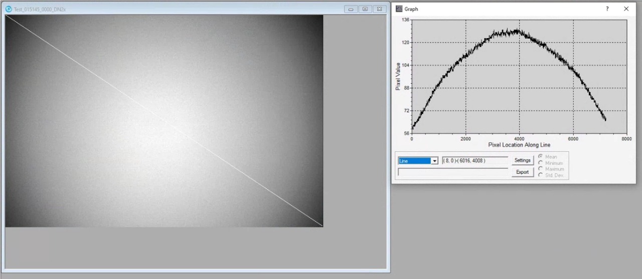 в углах ФФ сенсора освещённость, приблизительно 42% от центра.