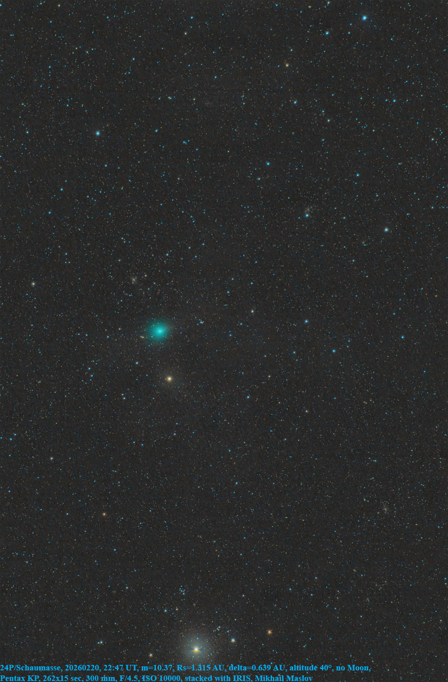 Цитата: feraj от 22 Март 2026 [15:19:37]63P/Wild 15 марта. Несмотря на яркость около 17 величины, видна довольно обширная хотя и очень слабая зеленоватая кома.Можно ли такую комету распознать при визуальном наблюдении в таком огромном количестве звёзд?