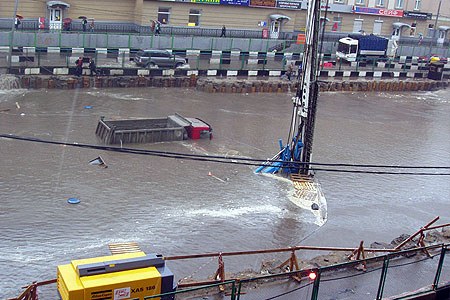 С утра из-за этого непрекращающегося дождя сегодня "задница" была на Хорошевском шоссе, где его пересекает ж/д мост . Пешком обойти было тоже проблематично, разлилось аж по всем газонам.