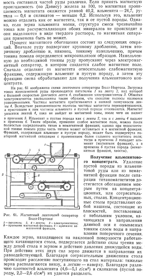 Как добывать титан, нам самим придумывать не надо, так как это уже придумано за нас. На картинке ниже - два способа отделения ильменита от прочих пород, один с помощью магнитного поля (ильменит - слабомагнитный минерал), а второй - разделением по плотности промывкой водой на столе. На этот второй способ нужно особенно обратить внимание, поскольку здесь выше в теме для разделения различных веществ по плотности выбирали экзотические плотные жидкости, в которых одни породы будут всплывать, а другие - тонуть. Как видим, можно поступить проще и обойтись обычной водой, которая, хотя и менее плотна, чем любая горная порода, всё же позволяет разделить их по плотности: