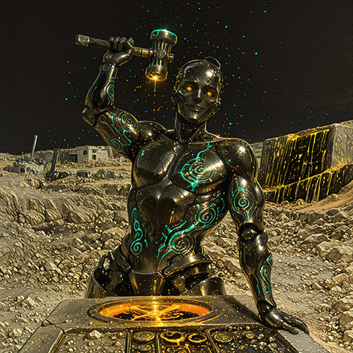 Иллюстрация из будущего: робот-кузнец готов ковать титан на Луне. Справа - отсек для производства и регенерации серной кислоты, видны потёки серы. Слева  вдали - жилой отсек для людей-инспекторов лунного роботизированного завода.