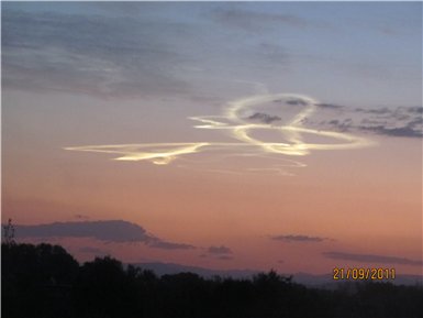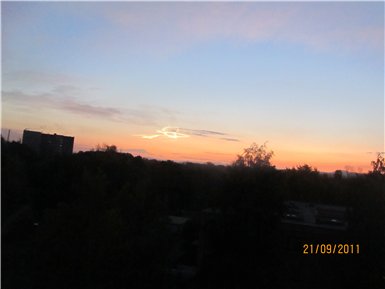 Всем - здравствуйте!Пожалуйста, не подскажете ли, что за сияющие вензеля в небе? На какие-либо облака или инв. след от самолета не похоже. Снимки сделаны перед восходом солнца в направлении на восток 21.09.2011, первый кадр - просто взяла мыльницу и щелкнула, второй - с максимальным приближением.