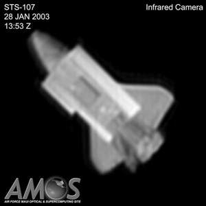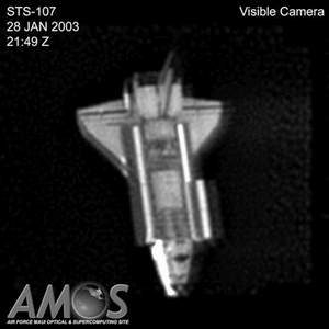На рис. 4–6 впервые приводятся фотографии, сделанные в конце августа – начале сентября 1989 г. с помощью телескопа АЗТ-24 на пункте оптического наблюдения на горе Майданак, расположенном на высоте 2700 м над уровнем моря. Объект на фотографиях – Lacrosse 1 (1988-106B), как он выглядит на дальности порядка 750–800 км. Диаметр телескопа – 1.1 м, фокусное раccтояние – 7.93 м. Поле зрения в кадре составляет 40 угловых секунд. На «сдвоенных» кадрах (рис. 5–6) показаны снимки с двух разных ракурсов. При этом изображение в виде множества размытых точек соответствует единичному кадру, полученному с экспозицией 1 мс. Второе изображение в каждой паре представляет собой снимок, накопленный из примерно десяти единичных, сделанных с интервалом 1 сек и отфильтрованных. На самом большом снимке показано накопленное изображение, прошедшее цифровую обработку. Искажения и «размытие» вызваны тем, что за время накопления ракурс аппарата непрерывно изменялся, так что даже два соседних кадра содержат два разных изображения. К сожалению, редакция не располагает более качественными снимками, полученными, например, с использованием аппаратуры компенсации атмосферных искажений (адаптивной оптики). Однако и публикуемые снимки могут дать некоторое представление как о самом аппарате, так и о возможностях наземных оптических средств, оборудованных специальной аппаратурой.http://www.novosti-kosmonavtiki.ru/content/numbers/213/04.shtmlРис. 1. Кадр из фильма о Национальном разведывательномуправлении США. Считается, что изображенный здесьаппарат – Lacrosse.