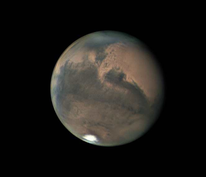 Марс от 25.09.2020 в 4:30 - 4:45.C14HD TV 2.5x IRCut ASI462MC, 140%;Совершенно новый workflow, включающий помимо прочего Topaz Sharpen AI и некоторые приёмы позволяющие поднять сигнал/шум без деротаций (она тут не применялась - результат из сингл-стека 4500/14600, продолжительность 2:30)