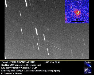 Cbet nr. 3367, issued on 2013, January 01, announces the discovery of a new comet (discovery magnitude 15.2) by the E12 Siding Spring Survey on images obtained with the 0.5-m Uppsala Schmidt + CCD on December 30.6. The new comet has been designated C/2012 Y3 (MCNAUGHT).