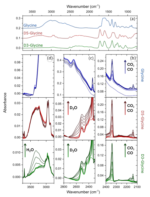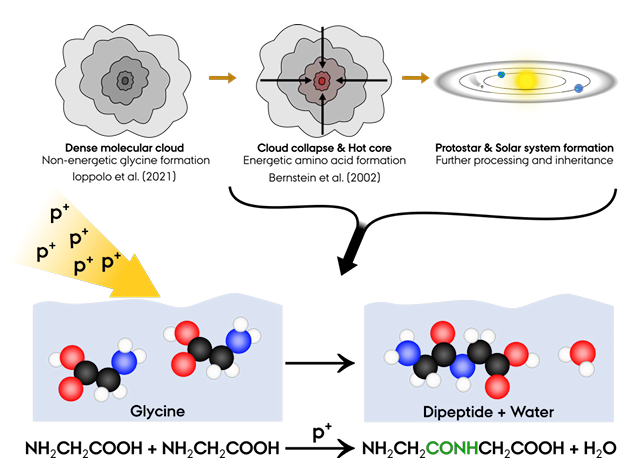 Существует термодинамическое противоречие, ставящее под сомнение классические модели возникновения жизни в водной среде. Жидкая вода, являясь универсальным растворителем для биологических процессов, на этапе предбиологической эволюции действует как деструктивный фактор: она способствует гидролизу — разрушению связей между аминокислотами, а не их формированию. Этот химический барьер делает спонтанную сборку пептидных цепочек в гипотетическом «первичном бульоне» ранней Земли энергетически невыгодным и маловероятным событием.Однако новое исследование международной группы физиков предлагает альтернативный сценарий, переносящий процесс синтеза за пределы планетных атмосфер. Экспериментальные данные свидетельствуют, что сборка сложной органики эффективно протекает в условиях глубокого вакуума и экстремально низких температур, где отсутствие жидкого растворителя становится определяющим фактором успеха реакции.Проблема водной средыСначала важно разобраться, что за химическое препятствие стоит перед зарождением жизни. Белки состоят из пептидов — цепочек аминокислот. Химическая связь между двумя аминокислотами (пептидная связь) образуется в реакции конденсации, побочным продуктом которой является молекула воды.Это создает термодинамическое противоречие, известное как «водный парадокс». Если жизнь зарождалась в водной среде (в так называемом «первичном бульоне»), то согласно закону действующих масс, избыток воды должен сдвигать химическое равновесие в обратную сторону. В воде пептидные связи стремятся разрушаться (гидролиз), а не образовываться. В современных организмах эту проблему решают специализированные ферменты и потребление энергии АТФ, но в пребиотическом мире таких механизмов еще не существовало.Авторы нового исследования предположили, что природа могла обойти это ограничение, перенеся процесс синтеза в среду, где жидкая вода отсутствует полностью — в глубокий вакуум межзвездного пространства.Верхняя панель (Top panel): Схема звездной эволюции. Показаны этапы, на которых, согласно современным представлениям, формируются аминокислоты. Данное исследование фокусируется на двух финальных стадиях (коллапс облака и образование протозвезды), где вещество подвергается наиболее интенсивной энергетической обработке. Нижняя панель (Bottom panel): Механизм реакции, открытый в данном исследовании. Под воздействием ионного облучения (имитация космической радиации) глицин превращается в глицилглицин — простейший дипептид, при этом выделяется вода. Процесс проиллюстрирован двумя способами: Слева: как это происходит физически на поверхности межзвездных ледяных пылинок. Справа: в виде химического уравнения. Зеленым цветом выделено образование пептидной связи — ключевого элемента для сборки белков в космических условиях.Автор: Alfred Thomas Hopkinson et al. Источник: www.researchgate.netЭкспериментальное моделирование космосаДля проверки гипотезы ученые использовали установку, способную воссоздать условия, царящие в плотных молекулярных облаках и протопланетных дисках. В качестве исходного материала был выбран глицин — простейшая и наиболее распространенная во Вселенной аминокислота.Тончайший слой глицина был нанесен на подложку в вакуумной камере и охлажден до температуры 20 Кельвинов (минус 253 градуса Цельсия). При та