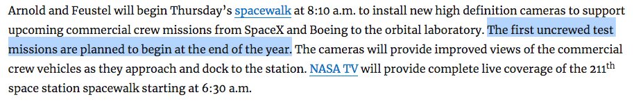 Беспилотные демо-миссии оба участника CCP проведут уже в конце года, а не осенью как предполагали.https://blogs.nasa.gov/spacestation/2018/06/12/two-nasa-astronauts-set-to-go-on-their-third-spacewalk-this-year/