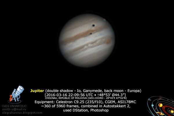 Цитата: smitty0 от 26 Мар 2016 [15:29:32]А вот и две тени, правда не вчерашние, нр всё же...очень хорошо, только небольшое уточнение - из-за диска Юпитера не Амальтея выходит,а Европа