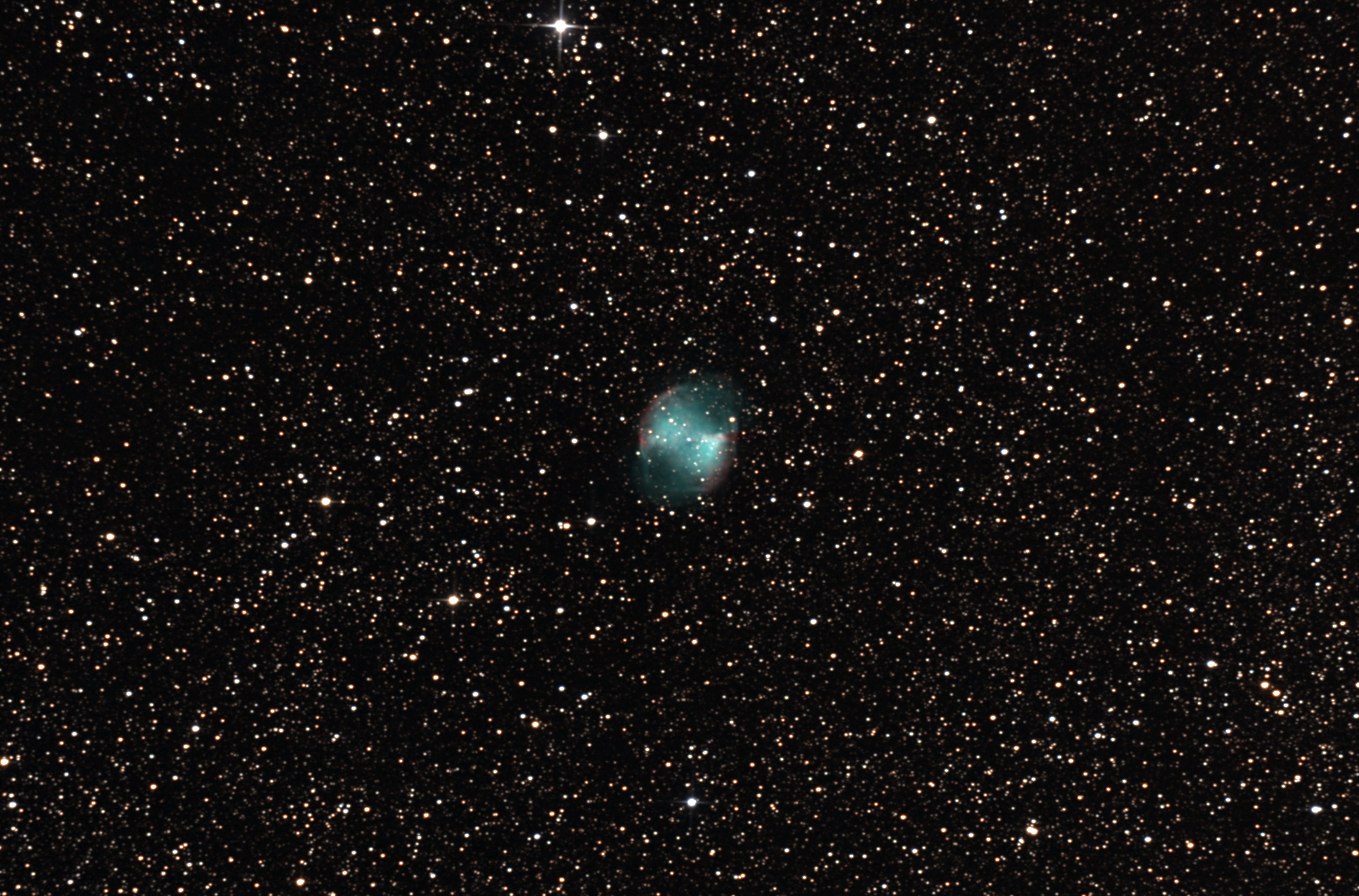 M27. Съемка ~50км от Челябинска на Canon 550D в прямом фокусе, монтировка HEQ5PRO, труба BKP2001, корректор комы Baader MPCC Mark III. Гидирование в Maxim DL c BK804 + QHY5-II. Выдержка 8x8мин, ISO800, 8 dark, 10 flat, 10 bias. Сложение и калибровка Maxim DL.