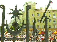 На Площади звезд в белорусском Могилеве появился необычный памятник - звездочет у телескопа. Прибор установлен с ювелирной точностью и служит стрелкой для солнечных часов. А по ночам он будет выполнять еще и роль своеобразного маяка - луч от мощного прожектора, вмонтированного в телескоп, возможно, будет виден даже из космоса. Автор идеи – мэр Могилева Виктор Шориков.