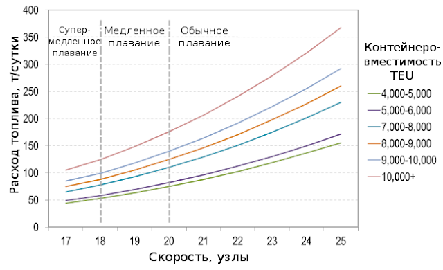 мощность двигательной установки судна зависит от куба скорости судна...общая энергия транспортировки соотвественно от квадрата...