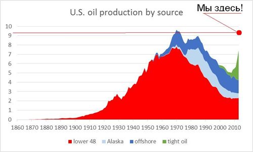 Цитата: Nucleosome от 17 Дек 2014 [22:14:58]приведённые вами данные никак об этом не говорят - почему - тема большая и написано в ней много.Ещё как говорят. Последние цифры говорят о том, что сейчас добыча нефти в страшно истощенных недрах наиболее геологически исследованной страны в мире почти достигла максимума 70х годов. Ещё немного и максимум 1970 года будет побит. И это на фоне низких цен на нефть. Даже картинку по поводу этой информации нарисовал:И потом такой же бурный рост добычи начнется в остальных регионах мира. Никто уже не будет продавать нефть дорого, все будут думать о том, как насытить нефтью и бензином развивающиеся рынки. Последует бурный экономический рост.Нефтяные пессимисты будут разбиты в пух и прах. Никто уже не сможет говорить всерьез о теории истощения нефти.