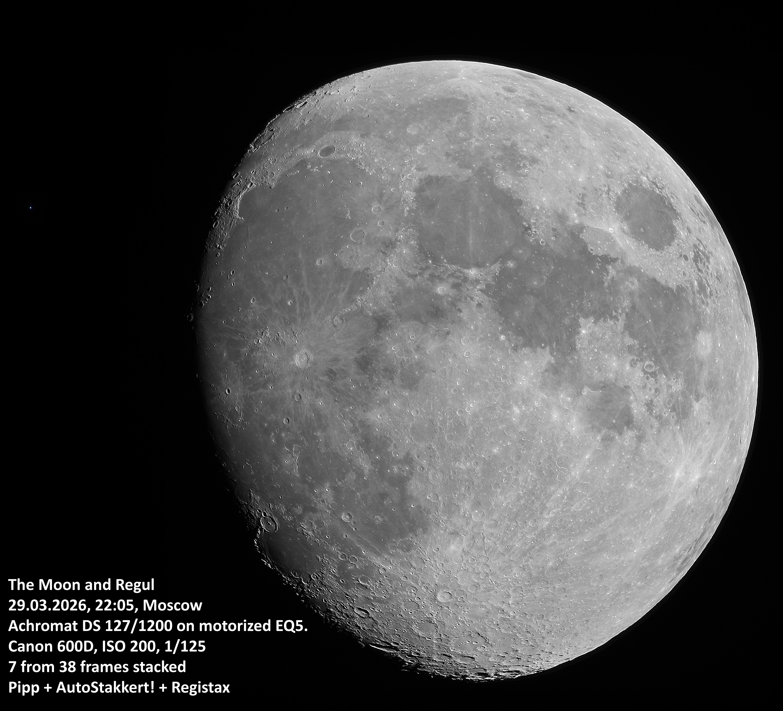 Сегодня в 22.30 - 23.00 тесное (~0,2 градуса) сближение Луны и Регула. Регул будет чуть севернее (выше) Луны.