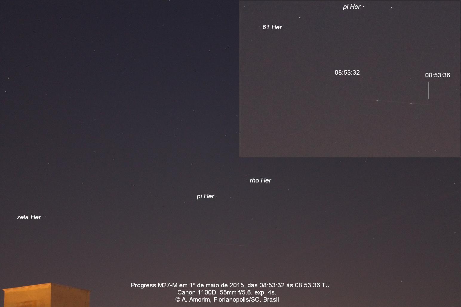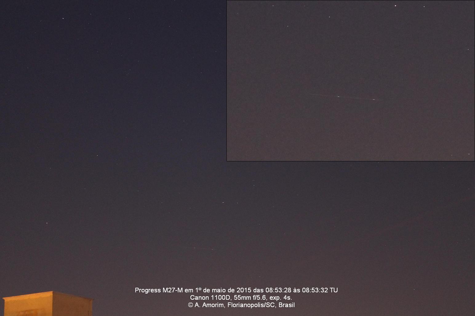 I want to share my observation made on 2015-May-01, 08:53-08:55 UT.Progress-M 27M (COSPAR id. 2015-024-A) was observed through 10x50 binoculars, at magnitude +3 with variations up to +2.5It wasn't a good pass from my location, but I took some images with more information, if useful, at these links