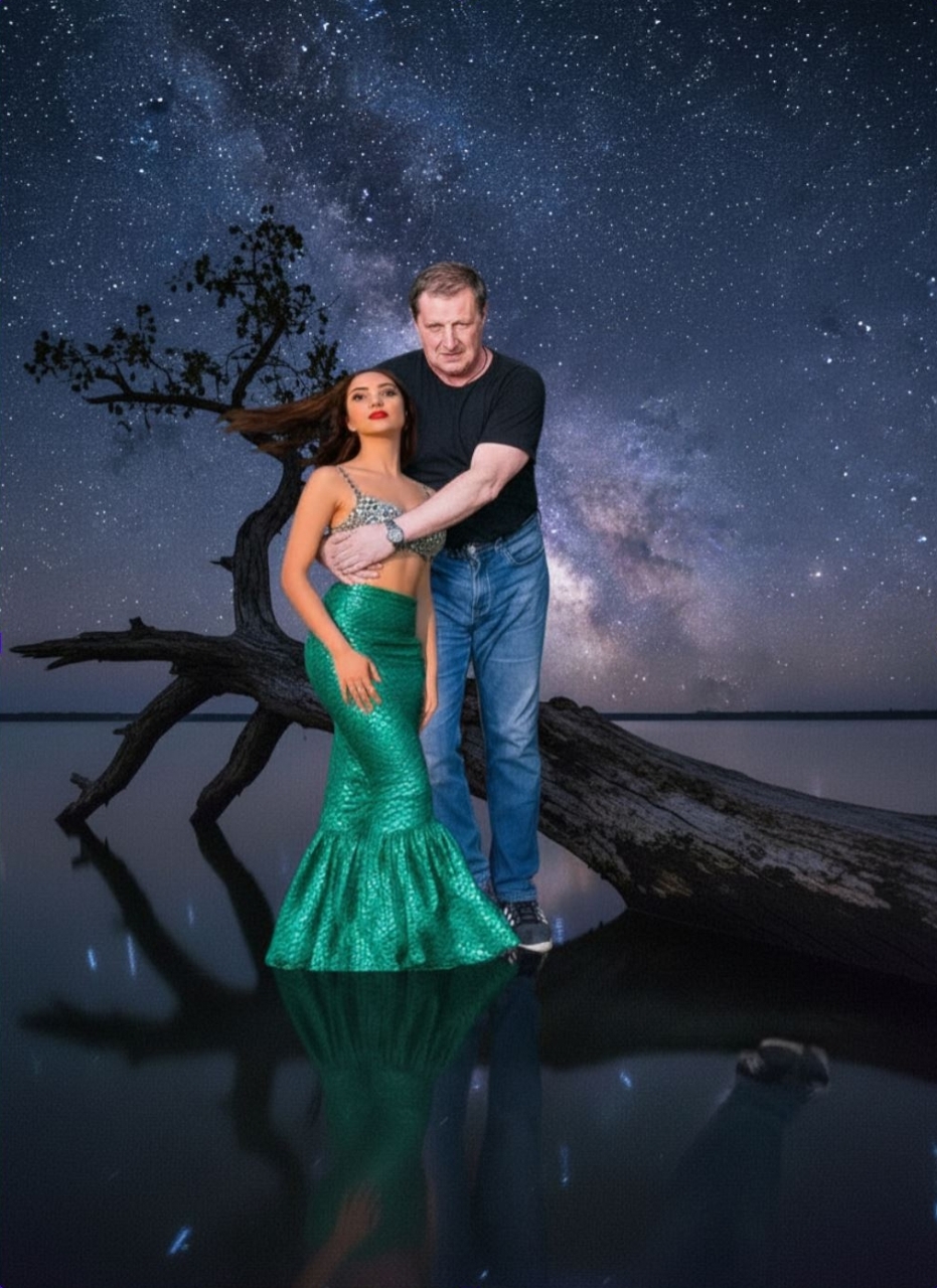 Мы тут с нейросетью немного покумекали и накреативили вот такую открытку. Кстати, дерево, озеро, Млечный Путь и Рустам на открытке - настоящие.