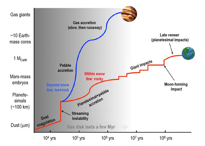 Современная теория миграции утверждает, что большие планеты формируются считанные миллионы лет, а небольшие планеты несколько сотен миллионов лет.