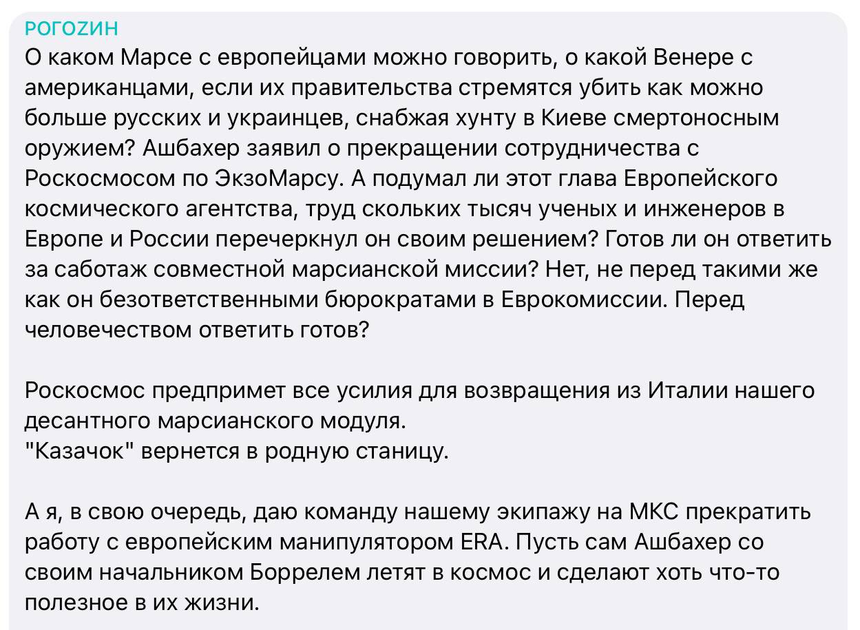 Цитата... риски угробить уникальный прибор значительно выше сиюминутной политической выгоды. А вот как накроется Розита причинным местом - кто косяки исправлять будет? Батутыч полетит с ремкомплектом на Федерации в точку Лагранжа?Рогозину на всё пофиг, он сегодня "дал команду" гробить европейский манипулятор ERA, предназначенный для российского сегмента МКС.