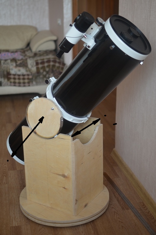 Здравствуйте! Делаю самодельную монтировку под трубу SW BKP2001.Выбрал простую конструкцию http://www.scopemaking.net/dobson/dobson.htm.В ней беспокоит поворот трубы по азимуту. Если усилие прилагать к трубе - как оно передастся на табуретку? Если труба лежит на фторопластовых пятачках, то не будет ли она проскальзывать?Или в добсонах для поворота надо крутить именно табуретку, а не трубу?Фото проекта монтировки: