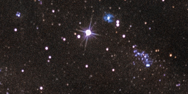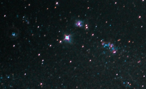 Самая слабая звезда (в промежутке между тремя яркими звездами) 9 зв. величины.