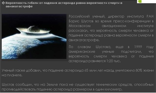 Цитата: leo-kaletaЕсть данные, что вероятность погибность от астероида такая же, как вероятность погибнуть в авиационной катастрофе.Да, что вы говорите? И сколько же человек уже погибло от падений астероидов по сравнению с количеством погибших в авиакатастрофах? За сто лет авиаперевозок? Заполните таблицу, пожалуйста.